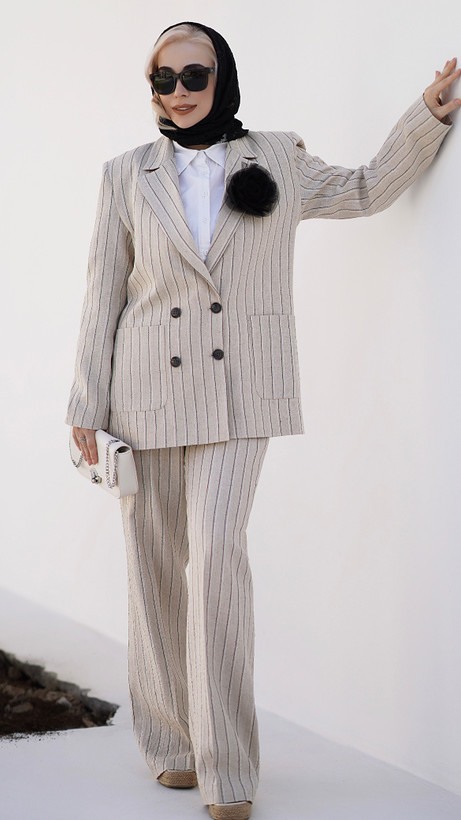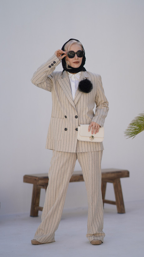 ست کت و شلوار مجلسی و رسمی زنانه جنس لینن راه راه فری سایز